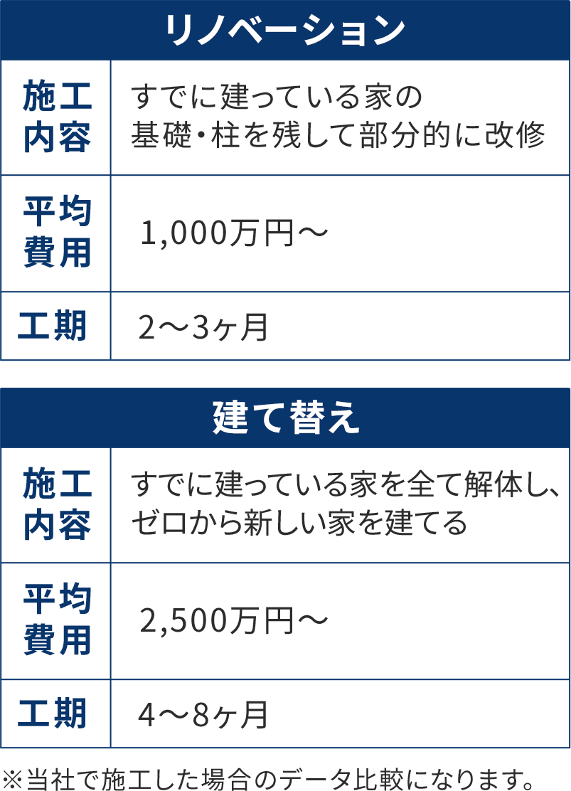 リノベーションは、建物の基礎部分を残して改修するため、解体費用がかかりません。工事中も住み続けられるケースが多く、仮住まい・引っ越し費用もかからないこともあります。